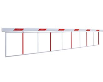 Юбочный комплект для стрелы DOORHAN DH-SKIRT изготовлен из алюминиевых планок, окрашенных в красный и белый цвет, что представляет собой дополнительную сигнализацию и выделяет шлагбаум среди окружающих предметов и строений. Благодаря шарнирному соединению в вертикальном положении происходит складывание юбочного комплекта вдоль стрелы шлагбаума. При опускании стрелы в горизонтальное положение, шторка вновь устанавливается в положение перпендикулярное стреле шлагбаума.